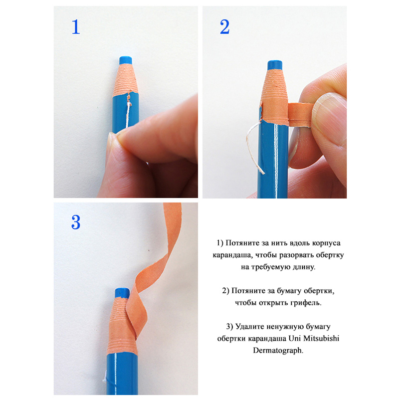 Чтобы «заточить» карандаш без точилки необходимо три простых шага: 1) Потяните за нить вдоль корпуса карандаша, чтобы разорвать обертку на требуемую длину. 2) Потяните за бумагу обертки, чтобы открыть грифель. 3) Удалите ненужную бумагу обертки карандаша Uni Mitsubishi Dermatograph.