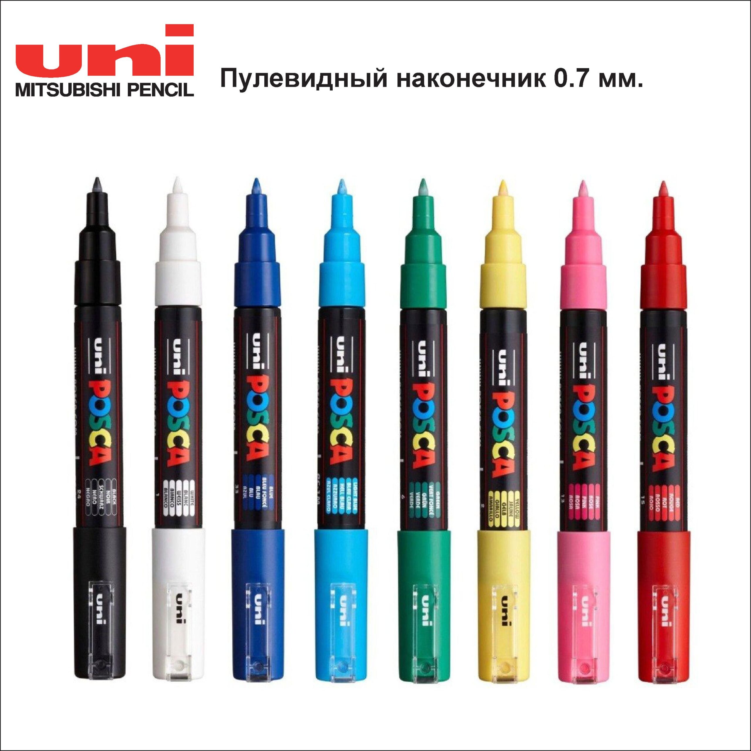 Сверхтонкий наконечник POSCA PC-1M имеет овальную (пулевидную) форму и создает линию 0,7 мм. Может использоваться для рисования, скетчинга, росписи посуды и других изделий.